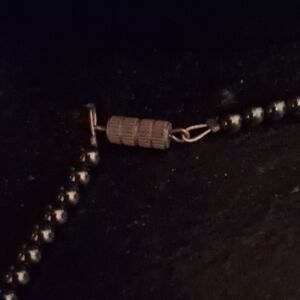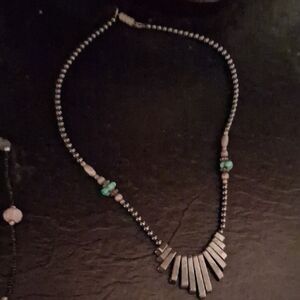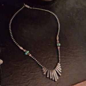 Boho hematite necklace with striking turquoise accents. Perfect for adding a touch to any outfit!