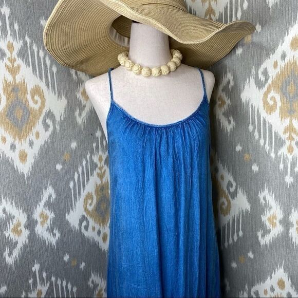 New with tags BOHO ME Tie Dye Maxi Dress. Clear medium blue washed crinkle rayon, with