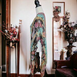 Beautiful shawl/poncho is turquoise, amber, orange, tan and black paisley colors. It has fringe at the hemline and the sleeves are batwing. Very beautiful. Looks great with black camisole underneath.