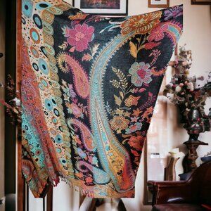 BOK Paisley Brown, Black and Turquoise Shawl Poncho with Fringe Elegant Style
