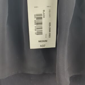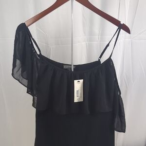 Lightweight off-shoulder blouse with fluttering ruffle overlay. Thin shoulder straps for support. Smooth body for a flattering fit. Elegant black color for versatile styling.