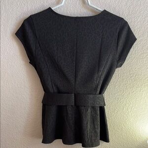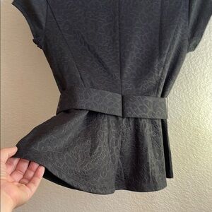Chic charcoal top with a unique pattern. Accentuated by a bold belt. Perfect for versatile styling.