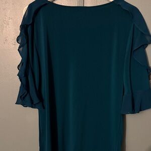 Chic and stylish deep teal blouse. Features elegant ruffle sleeves. Perfect for any occasion.