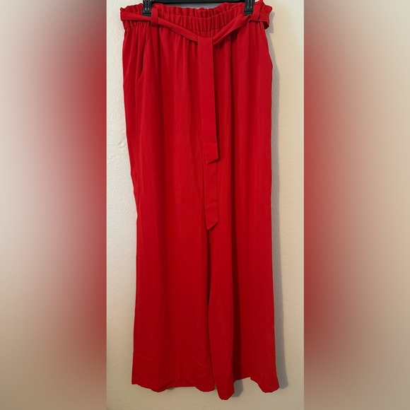 Bold red pants with gathered ruffle waistband. Easy to pair with tops for daytime or evening looks.