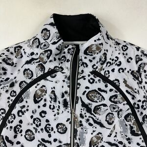 This BOLLE animal print jacket is a stylish and versatile addition to your wardrobe. Made from a blend of polyester and spandex, this short-length windbreaker features a full zip closure and long sleeves with thumbholes for added comfort. The jacket is perfect for travel, activewear, casual wear, or workwear, and is machine washable for easy care. With a unique animal print pattern in white and black, this M-sized jacket is suitable for women who love to play tennis, golf, or other sports activities. The stretch fabric ensures maximum flexibility and freedom of movement, making it ideal for all seasons. This lightweight jacket from the Bolle product line is a must-have for women who want to look fashionable while staying comfortable.