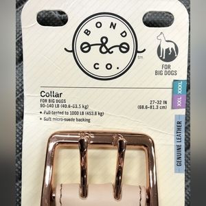 Bound & Co. Genuine pink leather (soft micro suede backing) with rose gold buckle and spikes. Collar is for big dogs weighing 90-140 lbs, 35" long, 1000lbs pull test. New with tags.