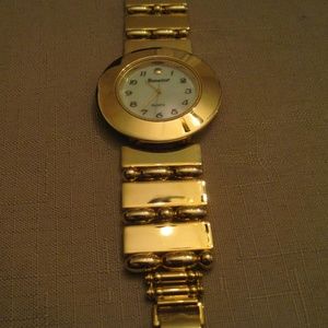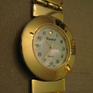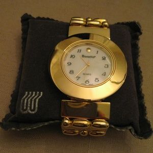Never Worn. Vintage 1980's Bonetto women's quartz watch wide gold tone metal bracelet watchband. Watch case goldtone metal mother of pearl face, overlapping clasp in original gift box with velvet pillow. Comfortable heavy weight. New battery installed prior shipping.
