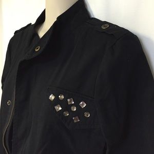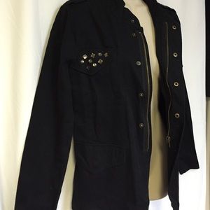 New with tags. Bongo cute black lightweight jacket. Name of jacket is 'Twill Tuxedo Jacket'. 2 functional pockets and 2 faux pockets. Jewels on the 2 top pocket flaps. Shoulder button epaulet detailing. Zip and snap closure. Back measures 21" from shoulder seam to bottom hem, front measures 24". (High low hem) 100% cotton. Tagged a MED, best to fit XS. Thank you for looking, and .... happy Poshing!! 🛍
