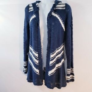 BONGO Womens Sweater Navy Blue Ivory Striped Fringed Aztec Hooded Cardigan Small