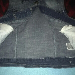 Bongo denim and plaid button up jacket with detachable hood, 2 small chest pockets that button, 2 lower front pockets. Red and black checkered pattern on sleeves and hood. Slightly distressed. Y2K dead stock