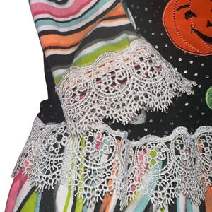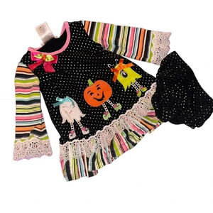 Halloween appliqué’s, dress by Bonnie Jean is designed with lace detailing and striped ruffles for added appeal.