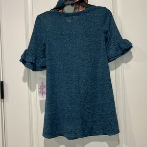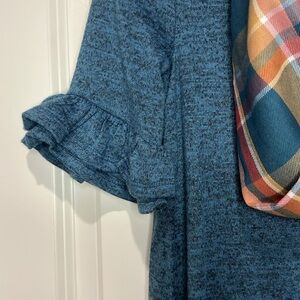 Bonnie Jean blue dress with ruffle sleeves and matching mustard plaid scarf