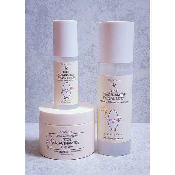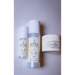 K-beauty trio with Niacinamide Serum (50ml), Mist (200ml), and Cream (100ml). Brightens, hydrates, and plumps for a radiant glow. Made in Korea. For all skin types.
