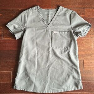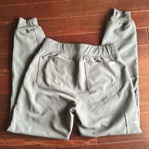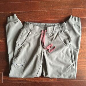 Comfortable olive green scrub set named bonsai. Includes top and pants size xs top and xs regular length jogger bottoms. Pink drawstring detail.