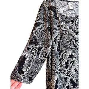 BONWORTH, BLACK & WHITE, PAISLEY PRINT TUNIC WITH LIGHT CATCHING SEQUINS. SCOOP NECK, 3/4 SLEEVE, SIDE SLITS. IN LIKE NEW CONDITION. SIZE L
