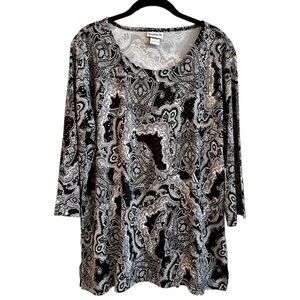 BONWORTH, BLACK & WHITE, PAISLEY PRINT TUNIC WITH LIGHT CATCHING SEQUINS. SCOOP NECK, 3/4 SLEEVE, SIDE SLITS. IN LIKE NEW CONDITION. SIZE L