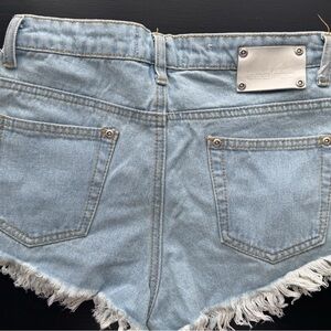 Stylish light blue denim shorts with a trendy frayed hem. Perfect for casual outings and summer days.