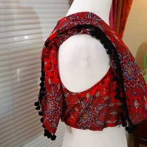 this top has black tassels at the bottom, a ruffle top can be worn on or off shoulder.