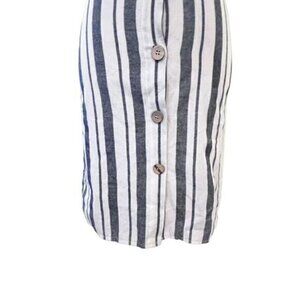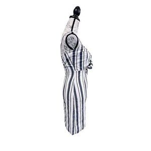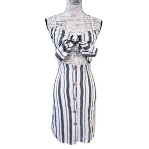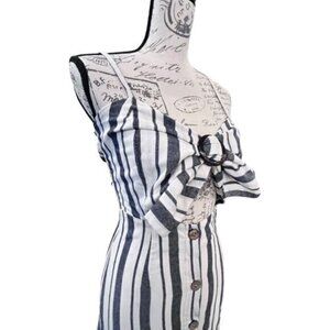 Made in Italy. Sexy bodycon dress in a linen type feel. Navy blue and ivory wide stripes. Front bow, skirt has buttons. Back has elastic. Spaghetti straps.