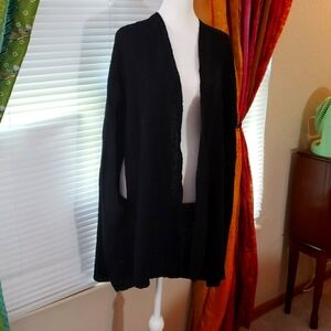 this is a sleeveless open cardigan type sweater. it doesn't button in the middle, it lasts open. it has low sleeve holes. the material reminds me of teddy bear fur.