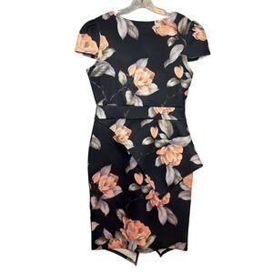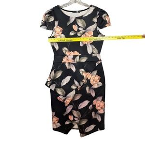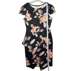 Black Floral Print- Fitted, peplum, asymmetrical, cap sleeved. Super flattering! Stretchy!