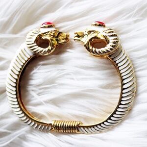 This beautiful double headed ram bracelet by Kenneth Jay Lane features thick, glossy, white enamel over gold plate, with oval, ruby red gripoix cabochons on ram heads.