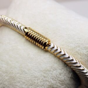 Bracelet perfect for larger wrists measuring 8". This piece has a spring hinge and is signed ©KJL on oval cartouche under ram's head. This bracelet is in excellent, previously loved, vintage condition.