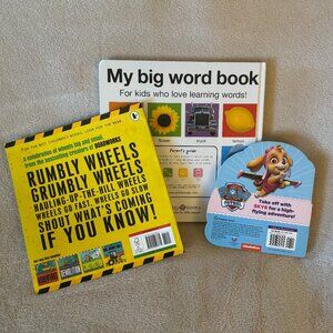 BOOKS For BABY Set of 3 for Ages 0+ Months include WHEELS (large paperback), MY BIG WORD BOOK (large board book), and PAW PATROL TIME TO FLY (small board book). Like new condition.