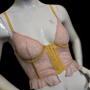 Pink and gold/yellow lace corset type longline bra by BOOTAY BAG. Features floral lace, underwire, 7 front hook & eye closures and adjustable straps. Excellent like new condition. Style # 5111121-PNK-XS