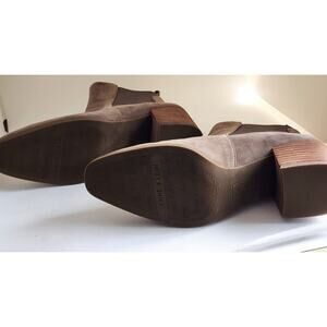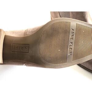 Nice pair of ankle boots by Anne Klein - iflex. These are a tan suede leather material. The upper part has elastic on both sides of the ankle for easy on and off. There are no zippers or other openings to put on and off. They boots have a block heal that is about 2.25" tall at the back. These look like new/hardly worn boots. They are SIZE 7M.