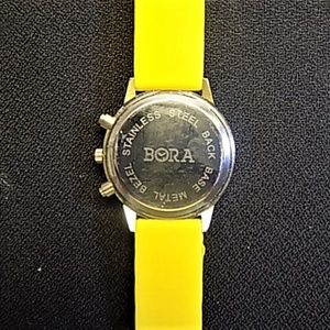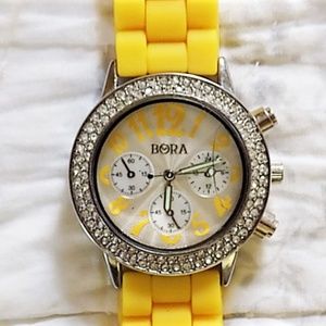 Featuring a very colorful with nice fashion appearance BORA YELLOW NUMERAL & SILICONE RUBBER BAND CRYSTAL BEZEL WATCH. We have installed a new battery and it works great.