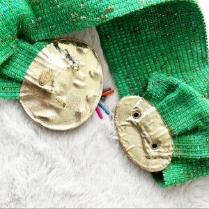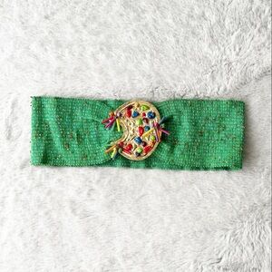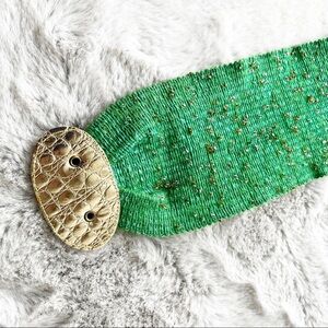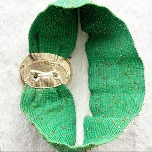 Features: stretchy green belt with all over random beading and a gold tone clasp with lots of rainbow textured beads