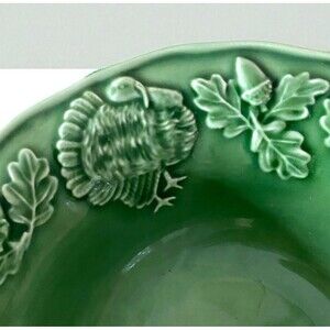 GREEN CERAMIC 7.5 DIAMETER SOUP / CEREAL/ SALAD BOWLS EMBOSSED WITH TURKEYS, OAK LEAVES & ACORNS