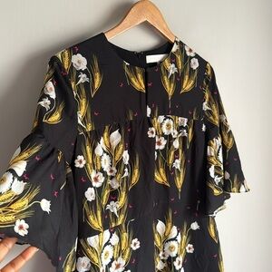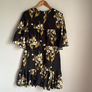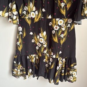 Borgo De Nor Resort 2019, Alba floral wheat cornflower print dress with a round jewel neckline, single button keyhole in front, concealed back zipper closure with ruffhem and short sleeves. This is a black dress with a peculiar flower design