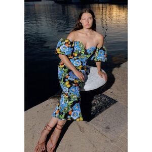 The Peonia Black Tati Cotton Dress has a sultry and sassy personality. With a flattering, sweetheart bodice shape and hourglass skirt, the sleekness of the bottom of this style is juxtaposed by the off-the-shoulder puff sleeves evoking a look that is both romantic and contemporary. The glamour of this shape and print is made easy to wear with the breathable cotton fabric, ideal for warm spring and summer nights. We love the contrast that the peonia print provides with its black background and bursting, bright blue florals, reminiscent of the gardens of Southern Italy.