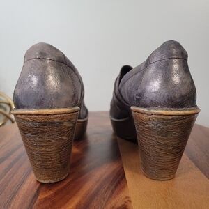 • Style tags: leather, metallic, antiqued finish. distressed leather, clogs, heels, retro, boho, bohemian, casual, comfy, comfortable