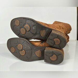 Women's camel brown suede lace back riding boots from BORN, size 8.5. Boot has side zip closure and 2" heel.