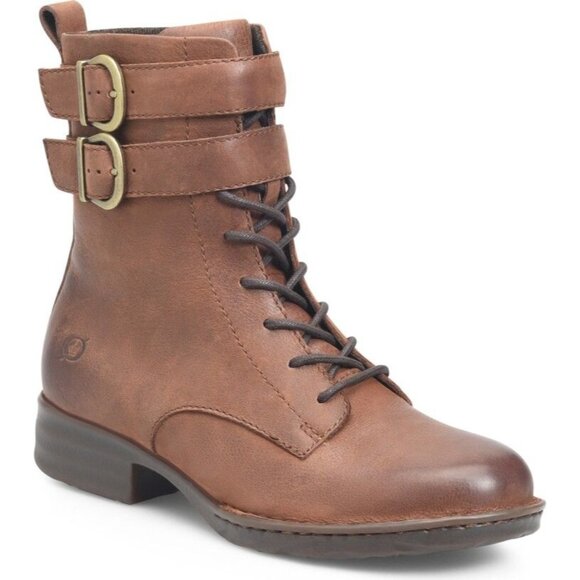 • BORN Camryn Genuine Leather Brown Double Buckle Strap Lace-Up Cognac Boots 8.5