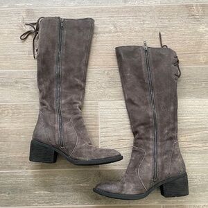 BORN Felicia Grey Distressed Suede Leather Knee High Boot. Distressed suede leather uppers with a round toe. Adjustable laces at top-of-shaft for a comfortable fit. Full-length metal side zipper closure, Soft and breathable leather lining. Fully cushioned footbed for added comfort. Durable rubber outsole. Heel height: 2", Boot shaft height approx. 14 3/4", Boot shaft circumference approx. 14 1/2" Color: Dark Grey. Size: 7M Condition: Excellent. Worn once only. Box included.