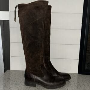 Gorgeous Women's Born Laguna tall knee-high riding boots with a smooth leather foot and a suede shaft. Very dark brown boots, have a drawstring at the top in the back to give you the option to wear them tight or slouchy. They have a low 1" heel. These are in excellent preowned condition with no issues at all. Worn very infrequently.
