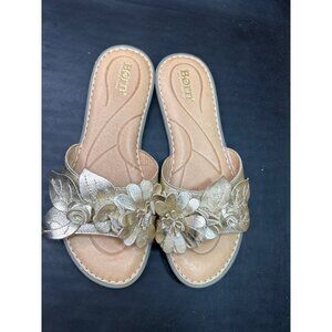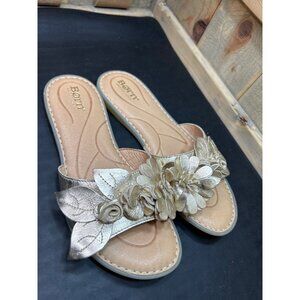 BORN Metallic Gold Leather Floral Slide Sandals Womens Size 7 Comfort Flat Summe