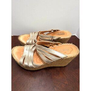 BORN Metallic Gold Leather Strappy Wedge Sandals Jute Espadrille Platform Size 8