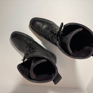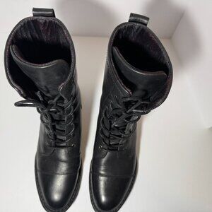 Born® black leather combat style lace-up boots for women, size 8.5. Leather upper, fabric lining, cushioned microfiber footbed. Almond shaped toe.