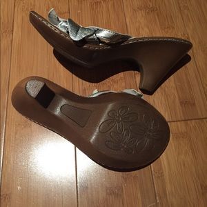 Silver leather flower motif hand crafted slip on with 3 straps to hold securely on foot. Very gently worn and padded