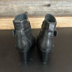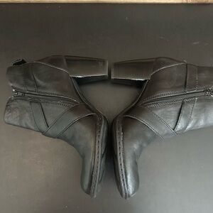 These ladies black leather BORN brand side zip booties, are a size 9, and are in good preowned condition. Please see photo that shows underside of the near peeling on heels… Cosmetic only. Please see pictures as they are part of the description and show the wear and condition of the boots. Questions? Leave a comment below!