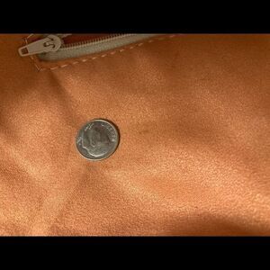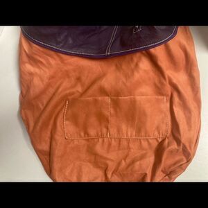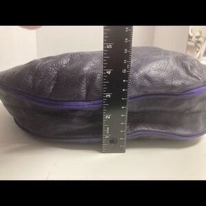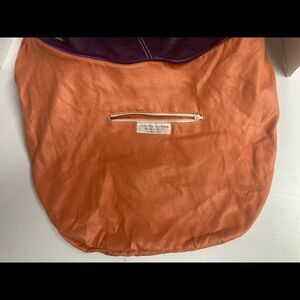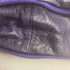 BORSE IN PELLE, Leather Purse, Orange Suede interior,15X3X8.5, Brand Stamp on front (see photo). Beautiful bluish purple leather with purple zippers. The orange suede interior has one zippered pocket and two smaller pockets. The orange interior has a couple of small spots that can be seen in the pictures. The dime is for comparison. Adjustable leather strap.