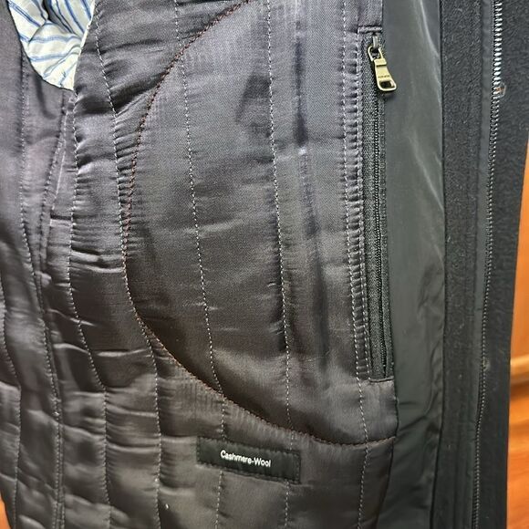 Button front and zip front. Lined. Interior compartments. Cashmere wool. Angled large side pockets.