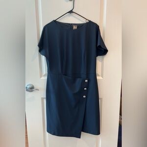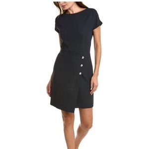 Smooth darts give a tailored look to this versatile sheath dress featuring a wrap-front detail with shiny buttons.