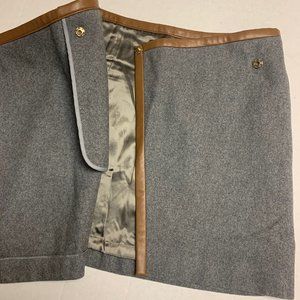 BOSS HUGO BOSS Stretch Gray Virgin Wool Wrap Skirt Brown Faux Leather Trim Sz 2.