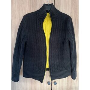 This jacket is double sided - one side is knitted and total black, another side made as a bright yellow nylon west with knitted sleeves. This side has a two side pockets.